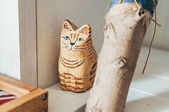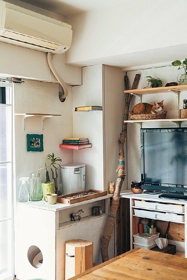 リビングに入って、真っ先に目に入ってくるのは、入り口と対角になる右奥の角。全体を片づける時間がないときでも、ここを死守すれば、なんだか部屋が整って見えます。拾った木にはひもを巻いて愛猫のつめとぎに。