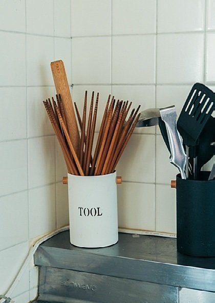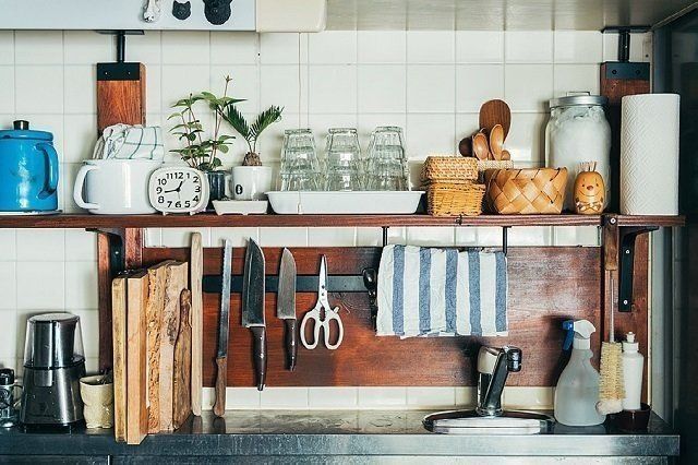 DIYで取りつけた柱に、棚やナイフホルダーをつけ、キッチン道具は見せる収納に。つまり、出しっ放しなので、ワンアクションで手が届くうえ、あちこちの扉を開けて探すなんて手間もありません。