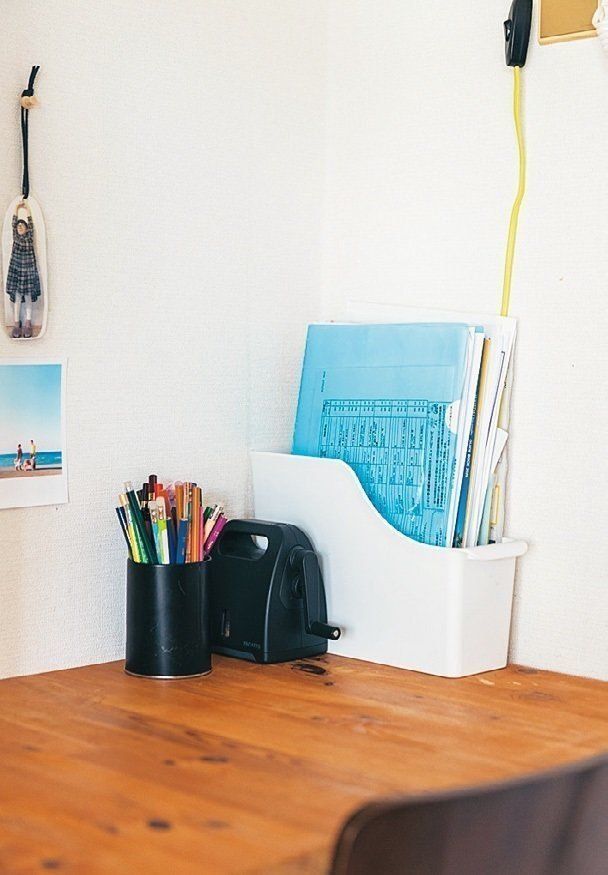 増える物の筆頭といえば、プリントなどの紙類。ファイルボックス1 箱と決め、用がすんだ物は即捨て。よく使う学校関係のプリントは、探しやすいように青いファイルの中へ。