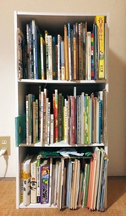 夫(52歳)、長女(18歳)、長男(13歳)の4人家族。子どもが大きくなっても大切な絵本。棚いっぱいに詰め込みすぎて取り出せない。