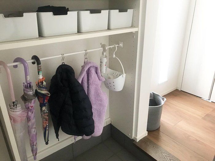 子どもたちのアウターが玄関に脱ぎ捨てられていることが多々あったというサンキュ!STYLEライターのsayaさん。シューズクロークの低い位置に、突っ張り棒とS字フックでアウターラックを設置したところ、小さな子どもも、自分できちんとかけてくれるようになったそうですよ。