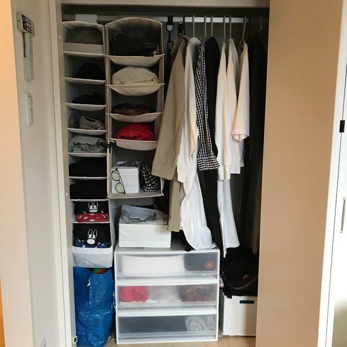 たくさんあった洋服を減らしたという、サンキュ!STYLEライターのマツさんは、吊り下げ式のラックや衣装ケースを活用して、クローゼットをすっきり整頓。引き出しにはシーズンオフのものや、ハンガーには今使うものなどというように分けているそうです。吊り下げ式のラックにたたんだニットを収納すると型崩れしなくて良いのだとか。