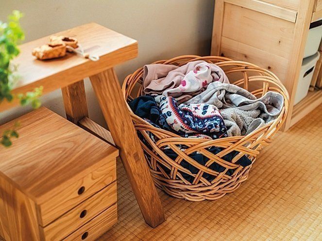 いちいちハンガーに掛けたりせず、カゴへポンと放り込むだけのルールにしました。子どもでも一瞬で片づけられます(yumihoさん/『サンキュ!』19年5月号)