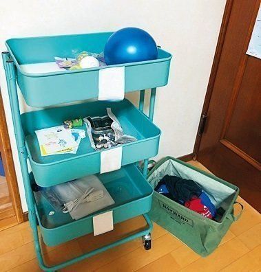 子どもが床に散らかした物をすぐに放り込めるように、移動できる3段ラックを用意。1人1段、一時的な物置き場を設けただけで、散らかった床がすぐに片づきました。