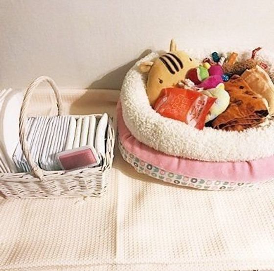 リビングを白、茶色、木目で統一。パッケージごと出しっ放しにしていたペットシーツや、カラフルなおもちゃもカゴに入れたら、気になっていた生活感が減りました。
