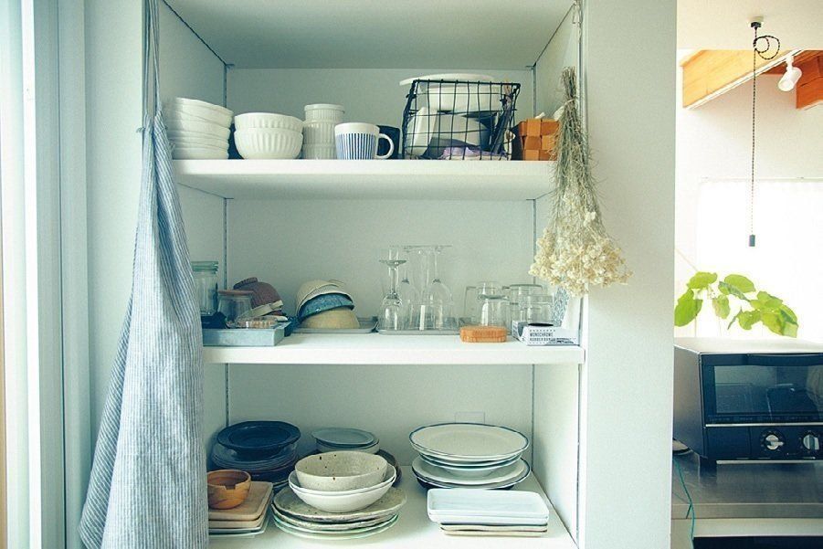 食器は、シンプルで何にでも使い回ししやすい物だけを厳選。扉がない棚だから、子どもでも出し入れしやすく、進んでお手伝いしてくれるように。洗ったあともサッと戻しやすい。