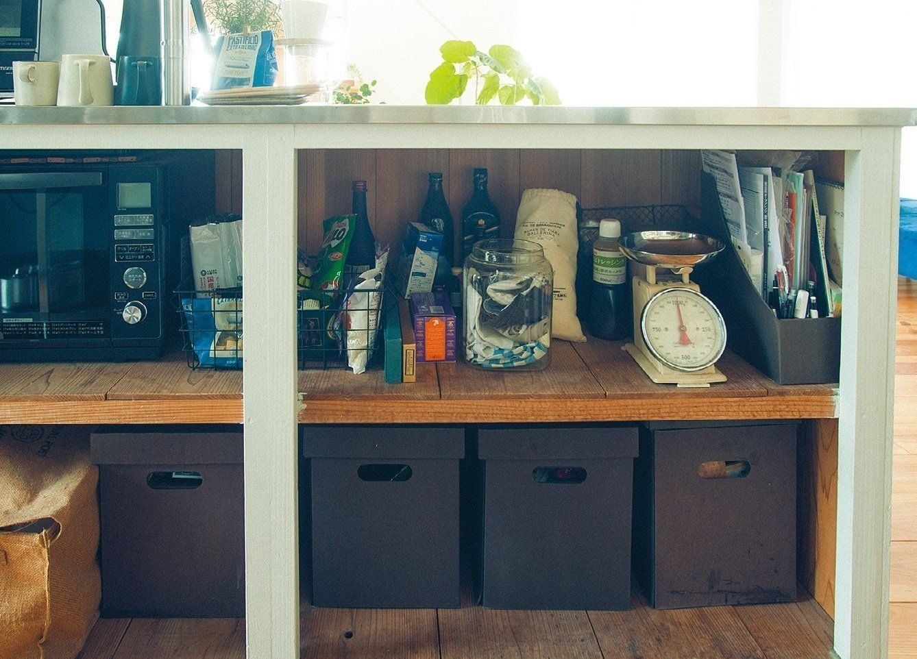 カウンターの内側は、きっちりしまうことより、出し入れしやすさを優先。上段はかごや書類ケースで大まかに分け、下段はふたつきの箱でそろえて、中身はざっくり収納にしています。