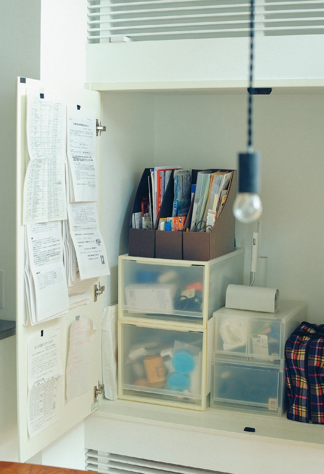 薬や文具、工具など家族共有の物はダイニングの収納庫に。書類ケースや引き出しで指定席を決めたら、家族も探し物ゼロに。「ここは唯一の扉つきスペースで隠せるので、中は多少ゴチャついていても気にしません!」。