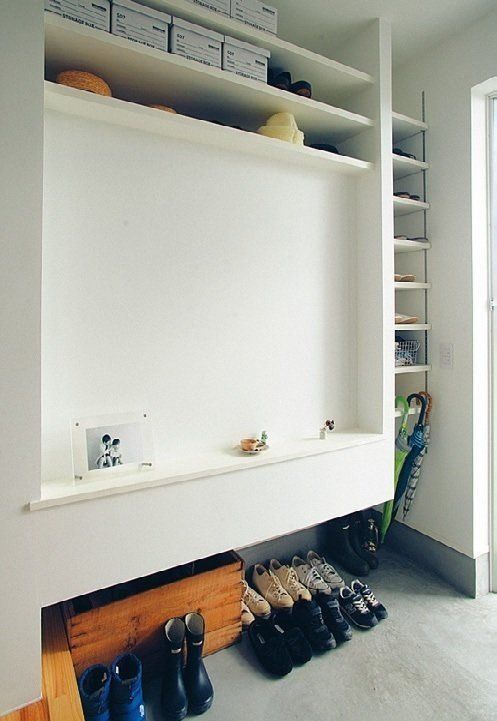 玄関も扉つきの収納スペースはなし。その分、ふだん使いの靴は棚下の端に寄せて置くルールに。出しっ放しでも、端に寄せるだけなので、子どもたちも自然と守ってくれます。