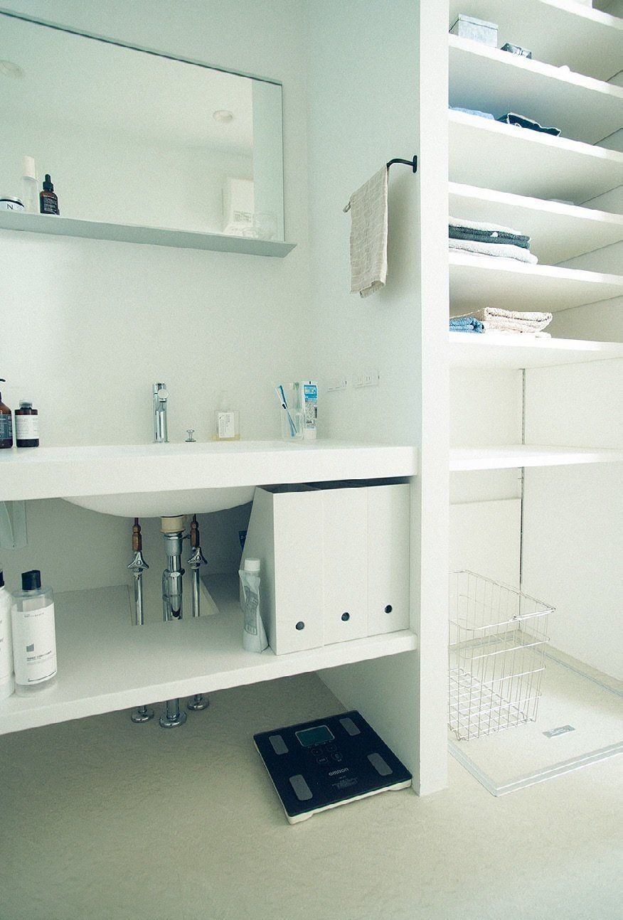 バスタオルは家族の人数分、タオルは8枚のみに。「毎日洗って室内乾燥しているので、この枚数でも十分です」。棚の1段分をあえて空けて、入浴時に持ってきた着替えを置くようにして、床置きをセーブ。