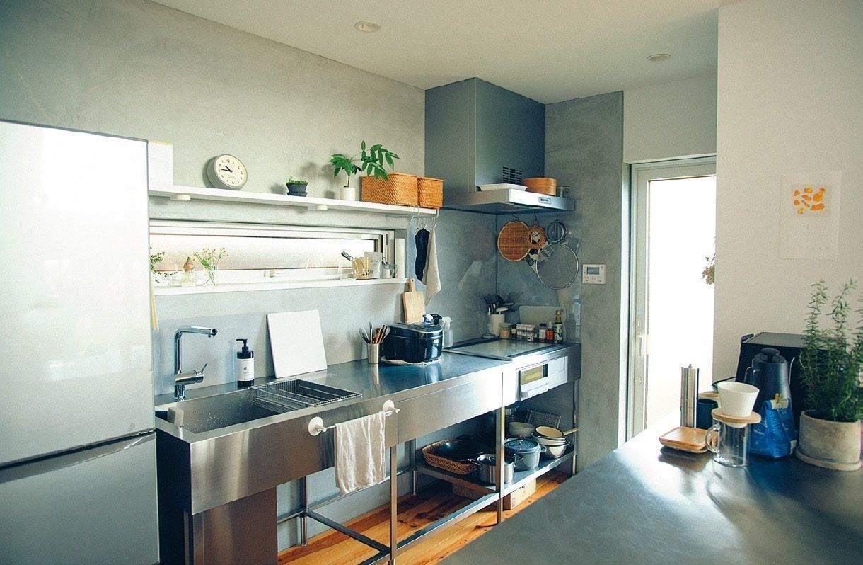 1日に何度も使うから、鍋や調理グッズは出しっ放しのほうがラク。でも、物を置くのは棚上だけ。鍋類は、1つで何役にも使える物だけにしているので、シンク下に置く量も最小限に。