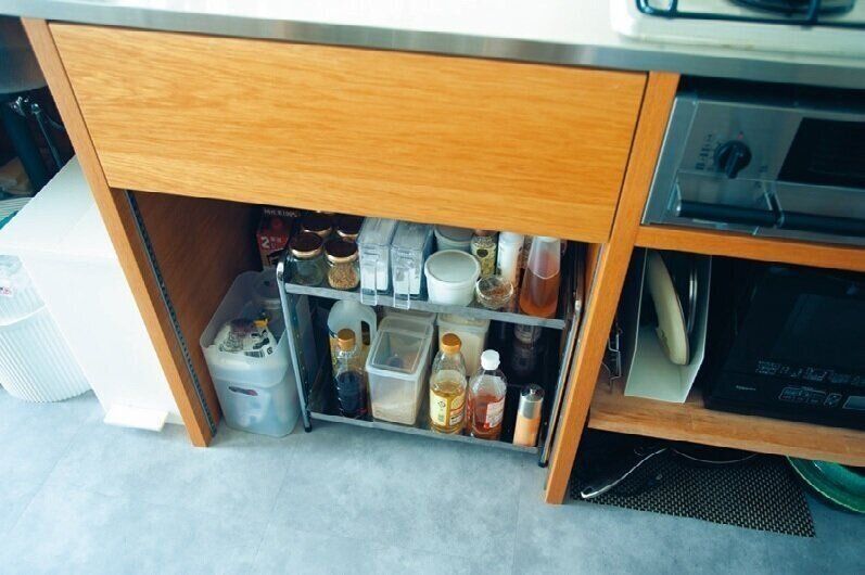 調味料は出し入れしやすい、オープン棚に収納。「左横のデッドスペースを上手に活用したいけど、まだ理想の収納グッズに出合えず……。でも妥協すると、いつかほかの物が欲しくなるから、手持ちの透明ケースで代用して出合いを待っています」。