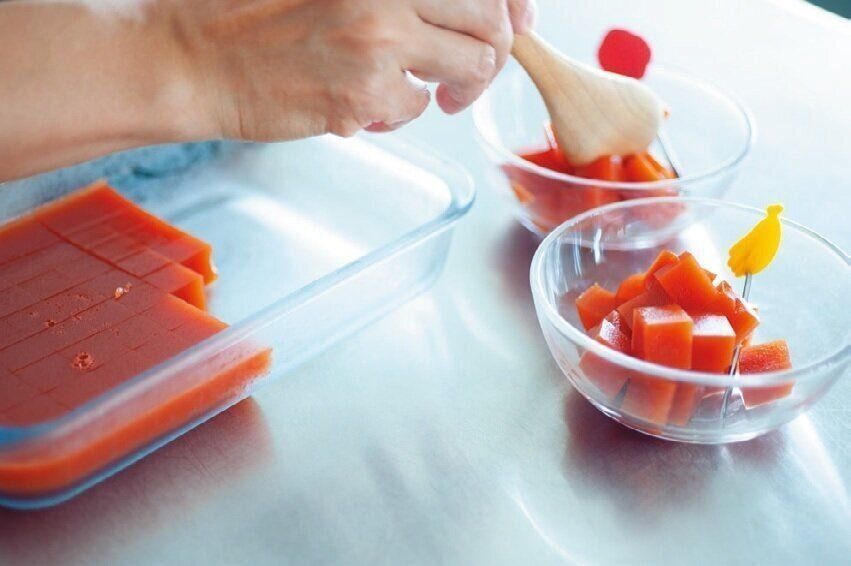 りんごジュース300ml、トマトジュース200ml、粉寒天4gを鍋に入れ、弱火で煮溶かす。バットに流し入れて余熱をとり、冷蔵室で約1時間冷やして完成。キューブ状にカットするのがmiiさん家流。