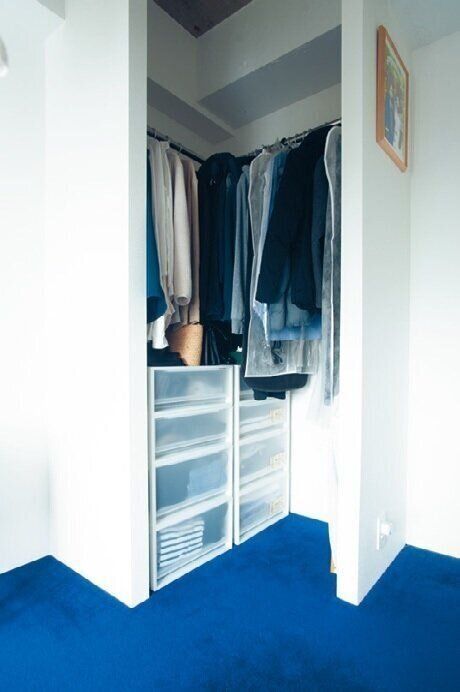 子どもの物が増えていくことを見越して、大人の服は2畳のスペースに収まるだけに厳選。「大人の好みはこの先もあまり変わらないので、今ある物を大切に着回します」。