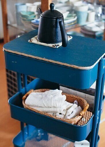 前の家で使っていた壁板をIKEAのワゴン上部のサイズに合わせて切り、本体と同色に塗って作業台に。買い替えなくても、ひと工夫で理想の家具が完成!