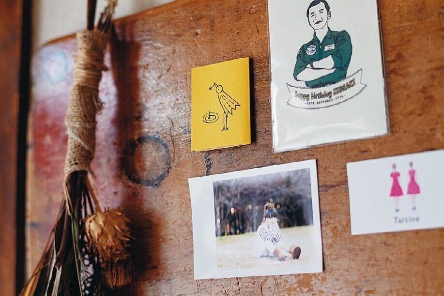 壁面には家族の写真に加えてショップのカードも飾るそう。「好きなお店のカードは高確率で好みのデザイン。住所などの情報ものっていて便利です」。