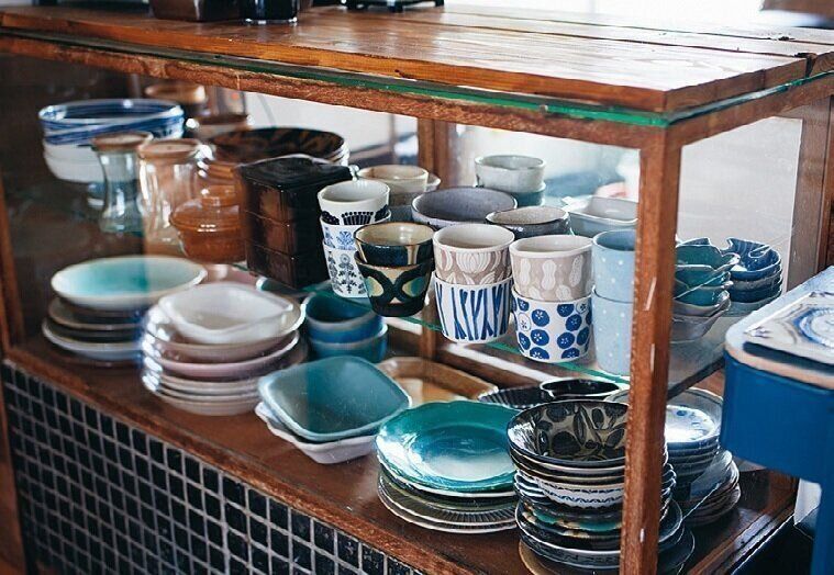 古道具屋さんで見て一目惚れしたという元タバコ屋さんのショーケースは、食器棚としてキッチンの中央に。どの面から見ても一目瞭然だから、家族も取り出しやすいとか。