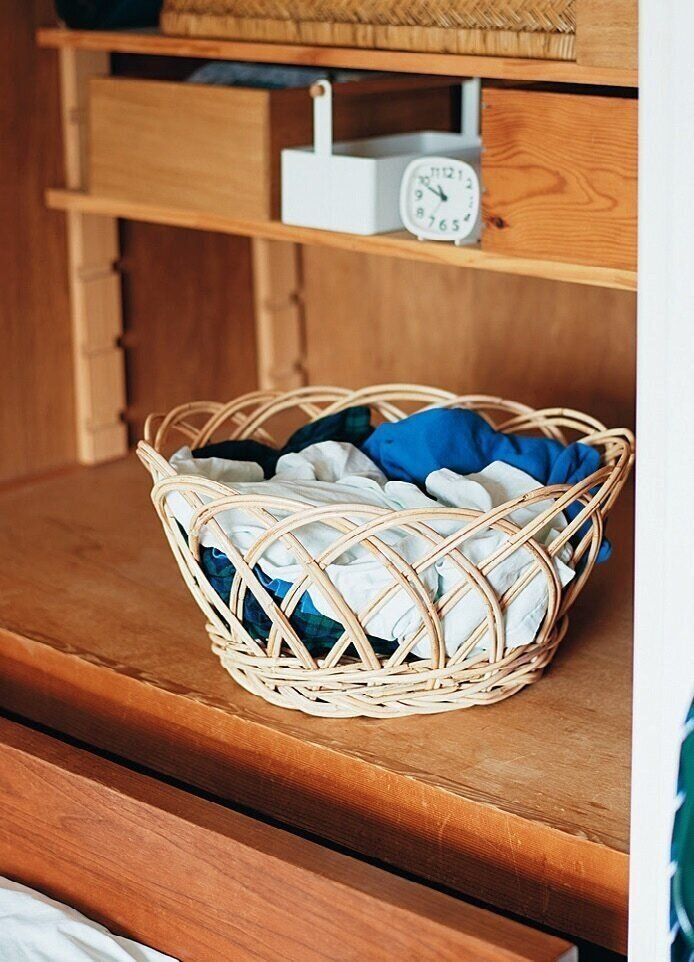 たたむかどうかは本人任せ。ざっくりしたたたみ方だったり、かごから出して着たりすることもあるようだけれど、本人がよければOKです。