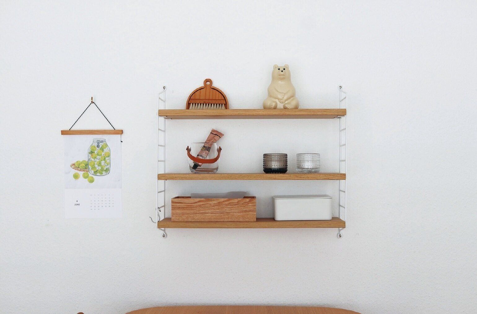 あちこちに散乱しがちな物はテーブル近くに棚をつけると自分で戻すように