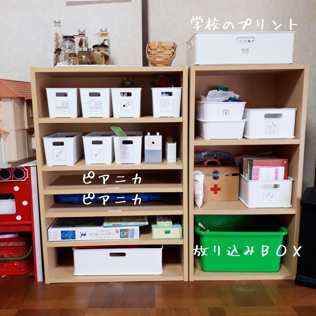 ワイドのカラーボックスなので、ランドセルラックに入らなかったピアニカも収納。