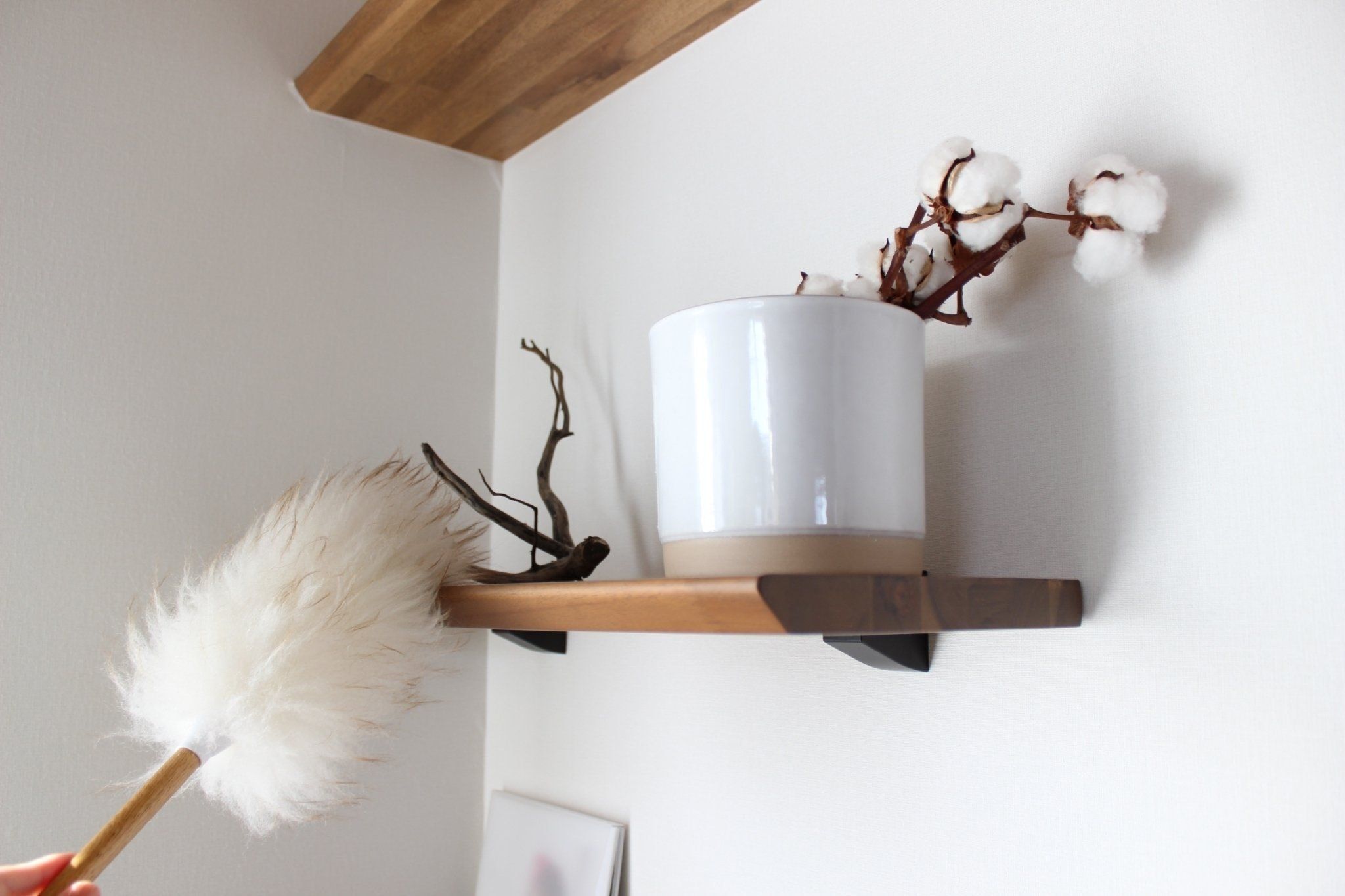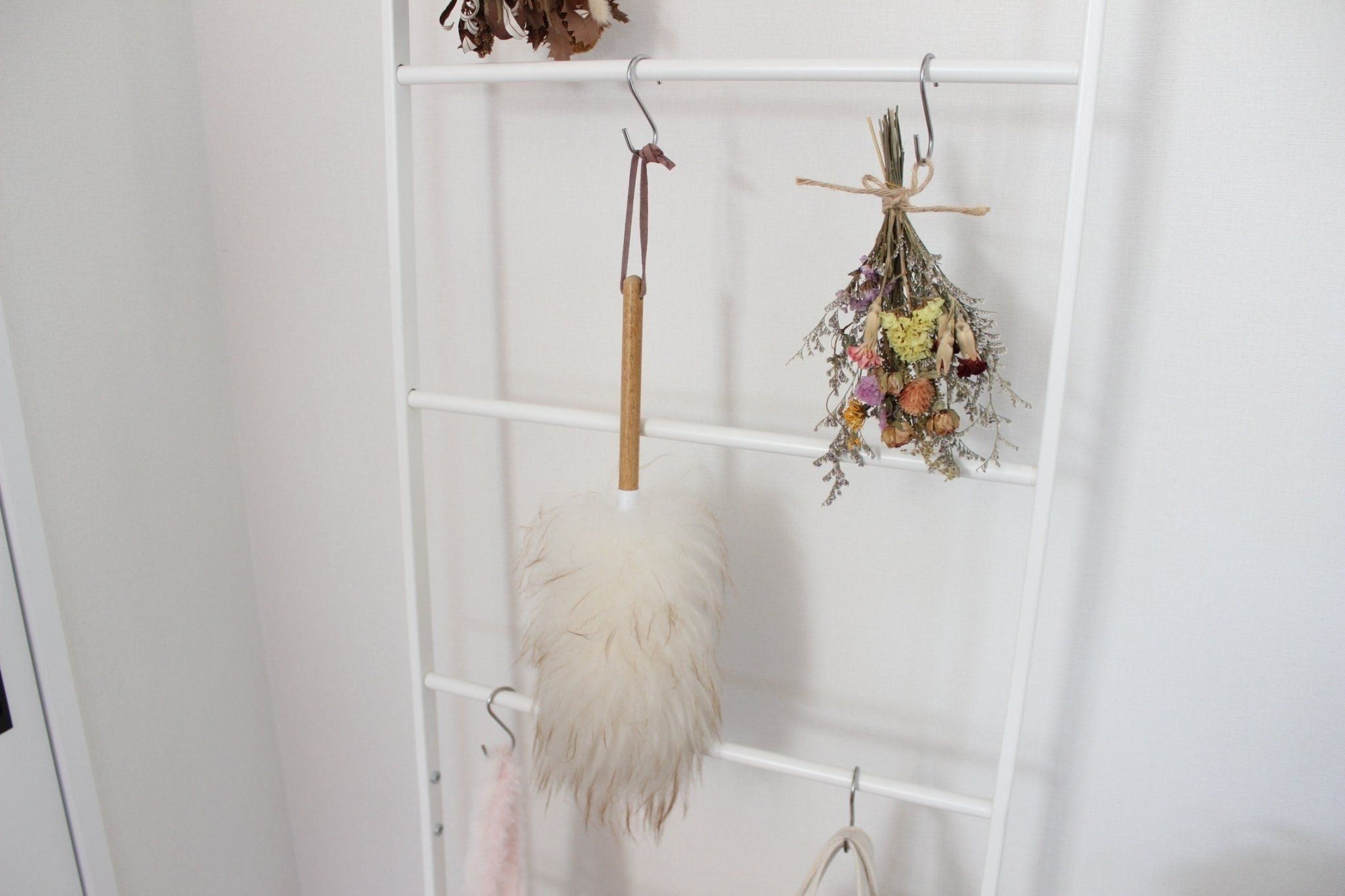 わが家では、タワーのラダーハンガーに羊毛ダスターを吊るしてインテリアといっしょに飾っています。