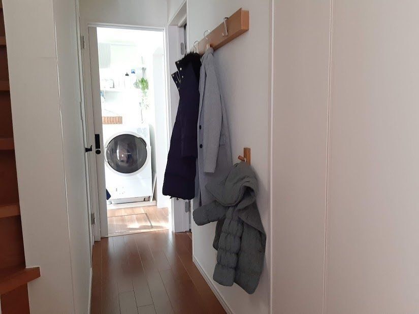 そこで無印良品の「壁に付けられる家具」シリーズの長押(なげし)を使用。こちらにハンガーでコートをかけて廊下をクローゼット化。この時期気になる花粉も、寝室にあるクローゼットに持ち込まなくていいのはうれしい誤算でした。