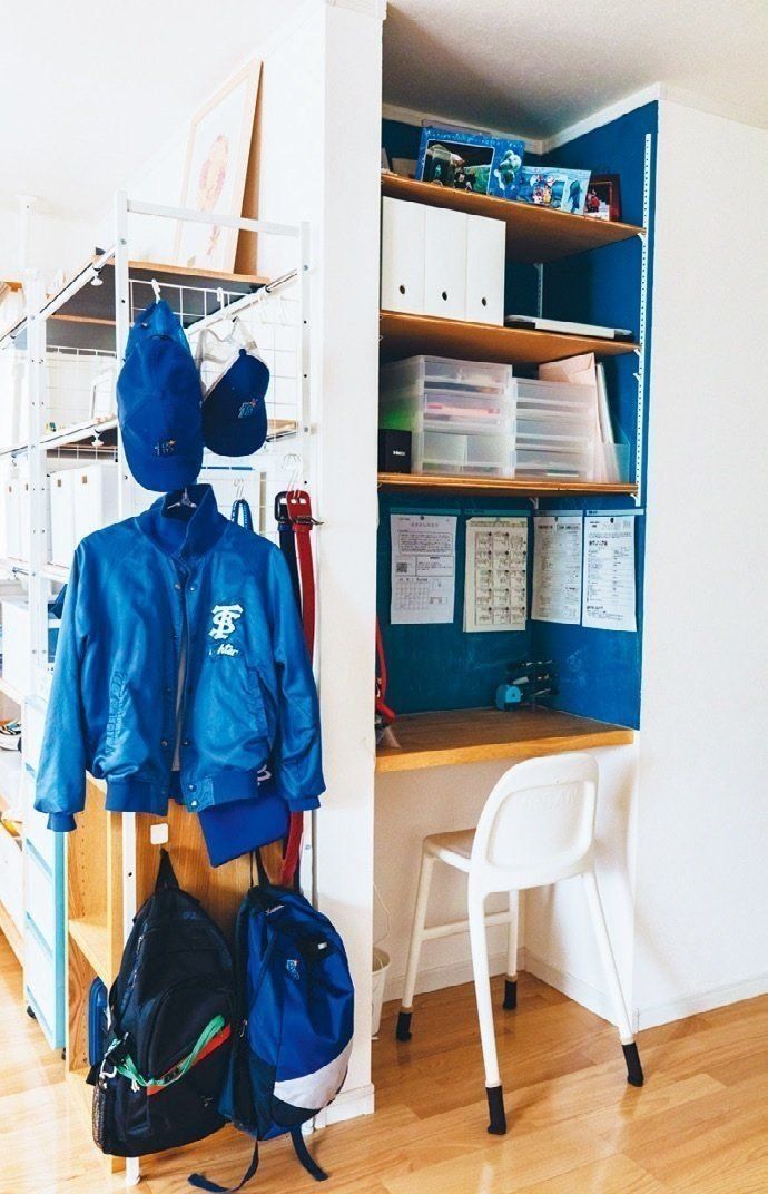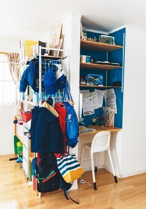 ラック横に子どもの上着やかばんが集中。デスクの上に夫が棚をつけてくれたけど、物があふれ、デスクとして活用できない状態。