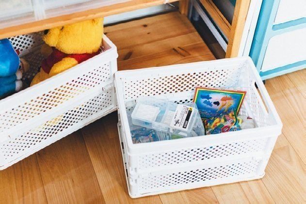 「今使う物」は、「人別」「用途別」に分けて箱や引き出しに戻します。出し入れしやすい入れ方、置き場所にも考慮して。「保管する物」は高い位置や押し入れなど、使用頻度が低い所に移動します。