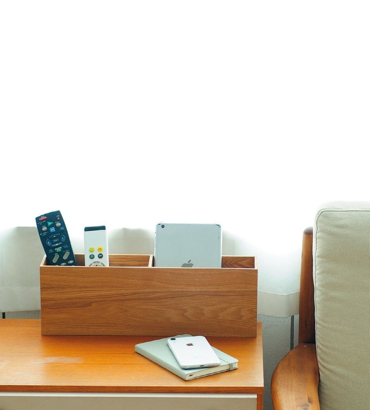 「部屋の隅っこに置きやすい絶妙なサイズ、チープじゃない木目、シンプルな形がいいんです」(大沢さん)。本来はスリッパラックですが、リモコンを入れるラックにもぴったり。
