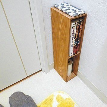 縦置きして、トイレ収納に!上段にコミック、下段には無印良品のフレグランスセットを。ラックの上はスマホ置き場としても便利♪