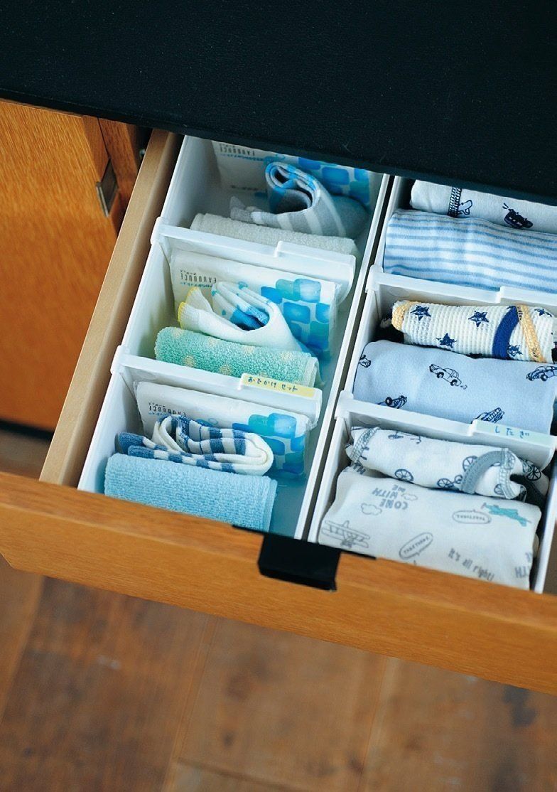 肌着&パンツ、ハンカチ&ティッシュ、靴下などを1セットずつ用意しておくと、子どもの毎朝の支度がスムーズ!「仕切りに安定感があるから、自分で組み合わせるタイプの仕切りより使いやすいんです」(インテリア班)。