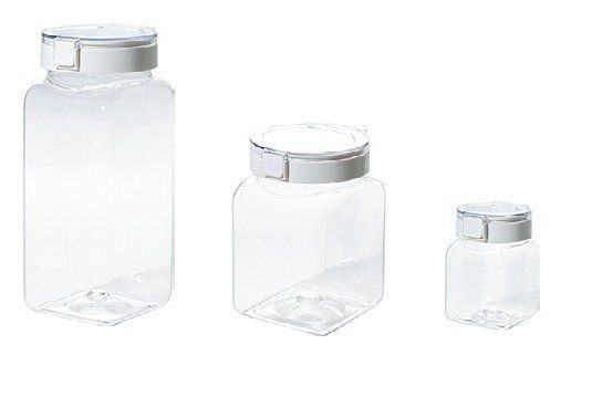 (右から)「ワンプッシュキャニスター350ml」(約W7×D8×H10.5cm)、「同 1100ml」(約W10×D11×H15cm)、「同1700ml」(約W10×D11×H21cm)¥277~