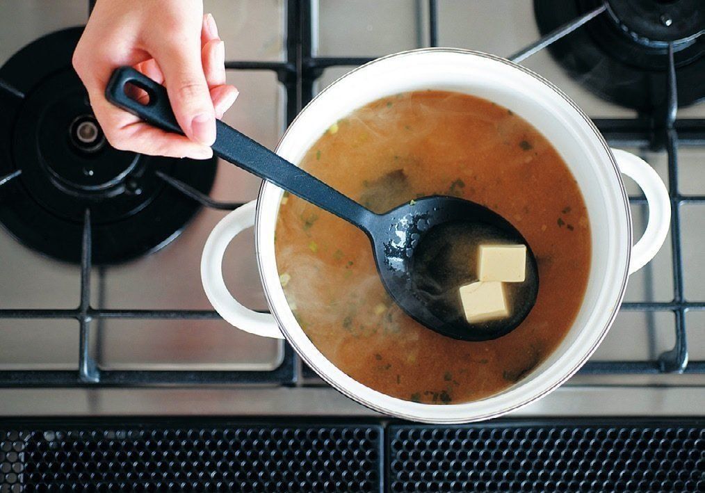 汁ものもしっかりよそえるほどよいカーブ。「シリコーン素材なので調理器具を傷つけず、鍋やフライパンに残った料理もきれいにすくえます」(本間さん)。