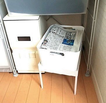 脚付トレーにボックスを置き、新聞を1週間分ストック。出し入れも床掃除もラクになるお気に入りの収納方法です。
