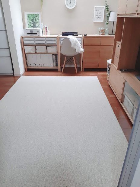 リビングのスペースが広くなったので今まで使っていたラグが小さくなりました。そこで寝室で使用していたカーペットを持ってきました。リビングで使用していたラグは寝室へ移動。サイズが大きくなった分さらに広く見えますし、毛足の短いタイプなので子どもたちが運動しやすくなりました。