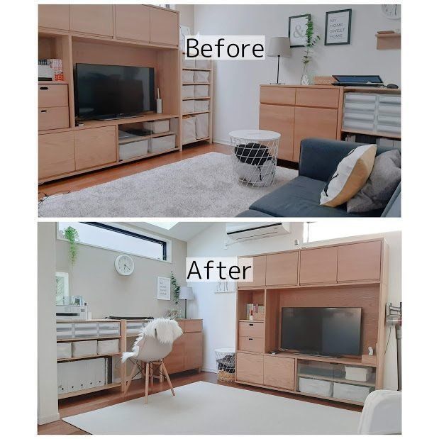 今まではリビングに入ってすぐ奥に大型家具を置いていました。つくりつけ収納のないリビングなので、わが家の貴重な収納スペースです。しかしどうしても圧迫感があります。大きな家具はなるべく部屋の手前に置き、低い家具は部屋の奥に置くと部屋が広く見える効果があります。ソファがなくなったことで、家具の配置の自由度が増しました。さらに奥の家具の高さをそろえることで、見た目もすっきりしました。今までおもちゃを入れていた無印良品のパイン材ラックを自分でカットして高さをそろえました。