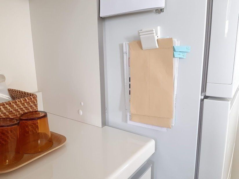 ダイニングテーブルに放置されがちな郵便物やDM。その場で開封してすぐに仕分けをします。優先度の高いものだけを保管して、家族や自分にとって不必要なものはその場で処分します。期限つきなどの重要な郵便物は、冷蔵庫横で私が一番目にしやすい所に貼って管理しています。手前から期限の早い書類順に重ねています。