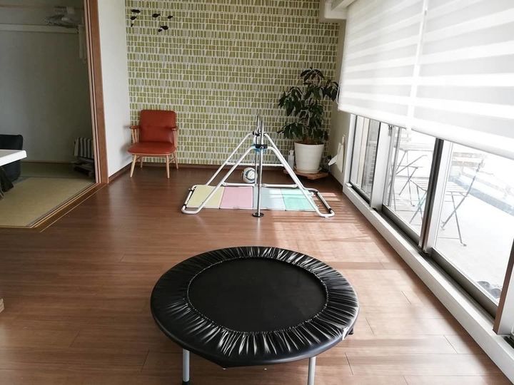 トランポリンは4つ折りのコンパクトに折りたたみもでき、大人も使えるものを購入しました。よく、音楽を流すので、音楽にあわせてトランポリンで飛び跳ねて、運動かつリフレッシュにもなります。