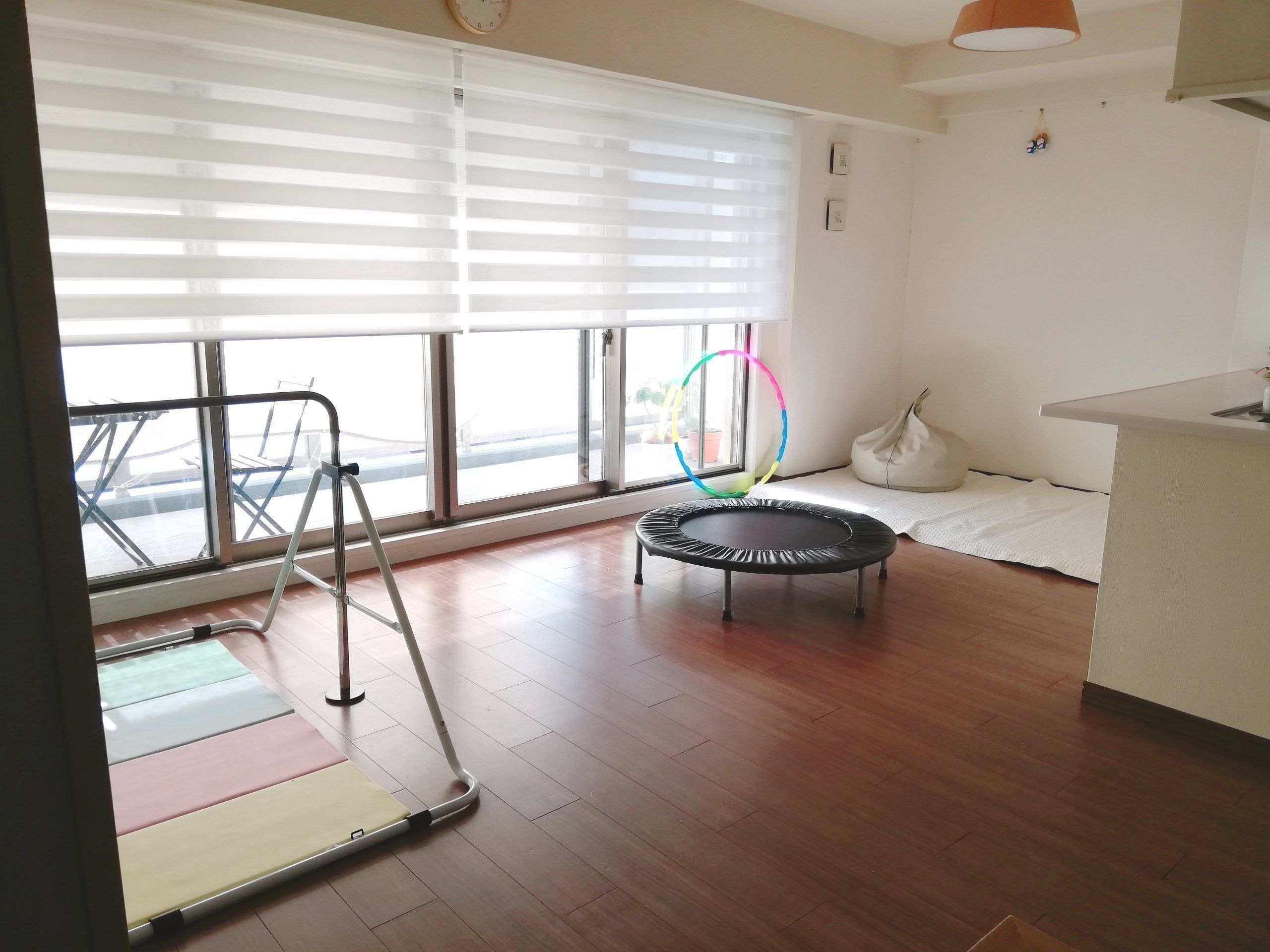 そのほかも、フラフープや柔らかいボール遊びで軽い運動を楽しんでいます。常に目に入る場所にあると、つい体も動いてしまいます。
