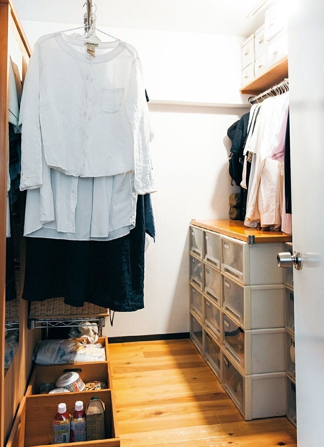 家族全員分の服は、1カ所につるして収納。人別に仕分けるために部屋をあちこち移動する手間がなく、家族も家事に参加しやすい。