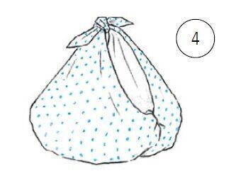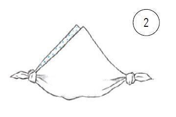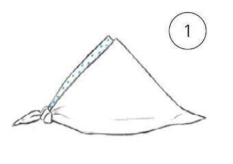 風呂敷の表面を内側にして三角に折り、片方の角を1つ結びにする。