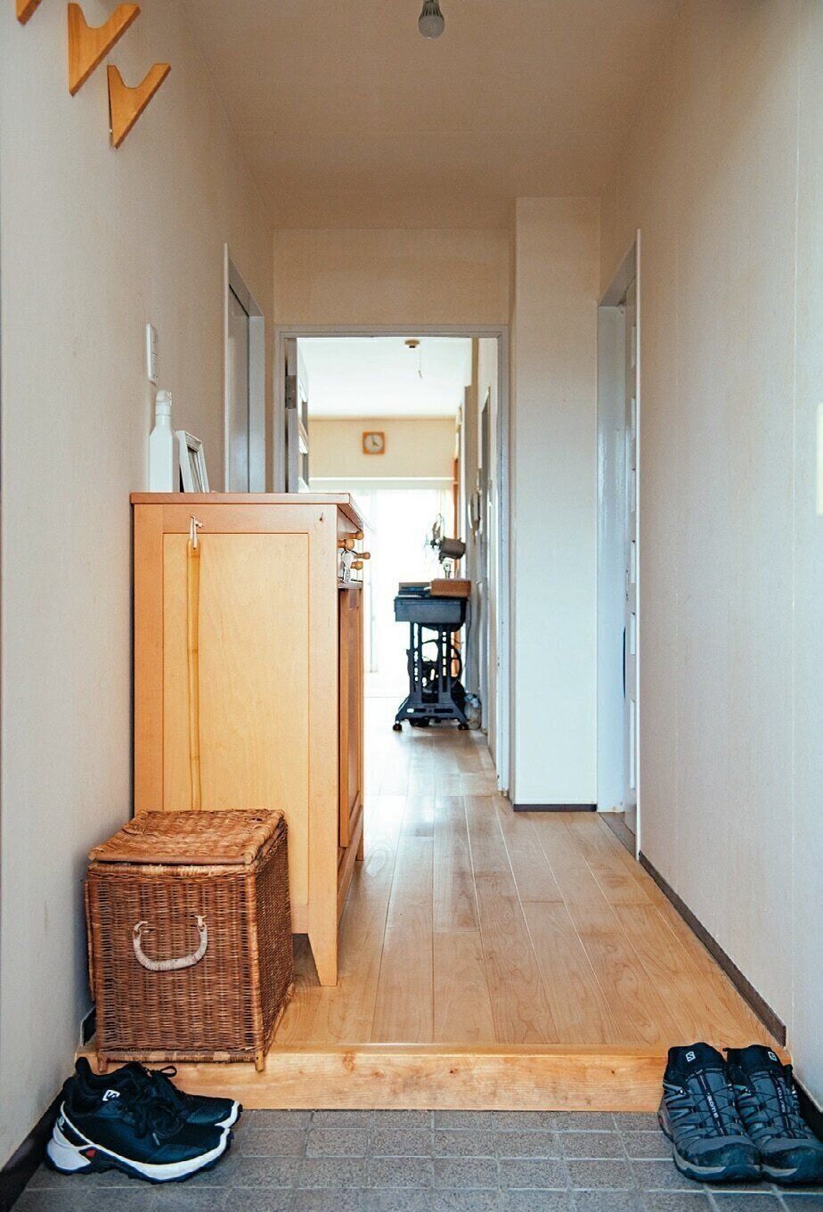 キャビネットには、家族全員分の靴と、鍵やティッシュなど外出時に必要な物を収納。表に出していいのは、1人につき1足の靴だけ。