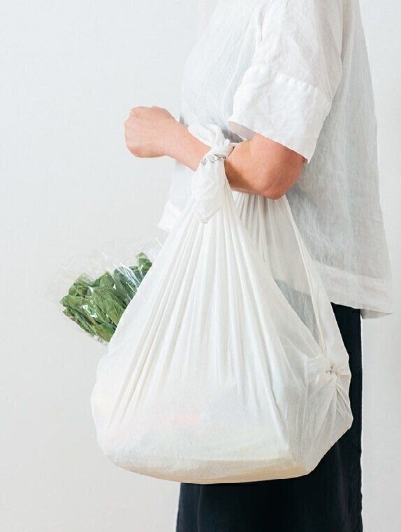 バッグの中でかさばらず、タオルにもなる"コットンの風呂敷"をエコバッグに採用。「結び目の位置を変えれば、買い物の量に合わせて大きさも変えられます」。