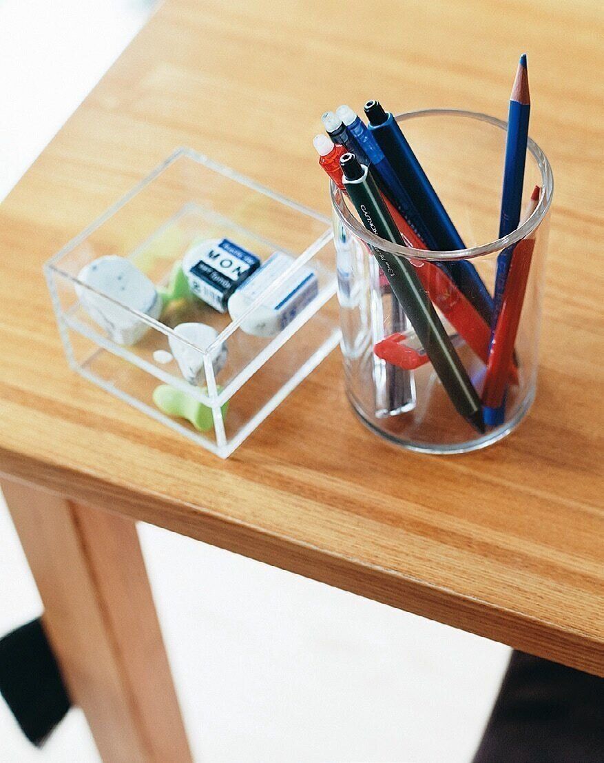 長男と長女はダイニングテーブルで勉強するので、ペンと消しゴムは多めに用意してシェア。あちこちに置かない分、きちんと使い切れます。クリアなケースは、出しっぱなしでも圧迫感がないうえ、数を把握しやすいので、増えすぎ防止にも!
