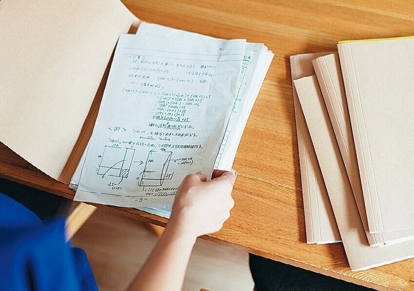 子どもごと、学校や学童など種類別に分類。新しい書類が届いたらいちばん上に重ねて、月初めに下から見直して古い物を捨てます。紙ファイルは何枚はさんでも対応しやすくて便利。