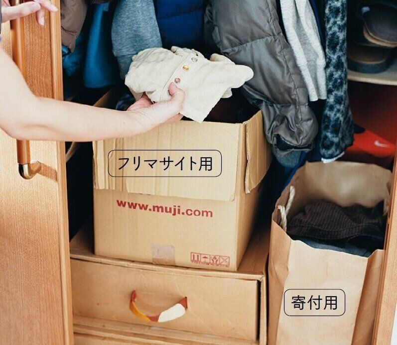 まだ使えるけれど出番がない服は、フリマサイトで売るか公共団体に寄付。使ってくれる人に譲ります。"手放しBOX"を常設することで、不要品がたまらずスムーズに手放せます。
