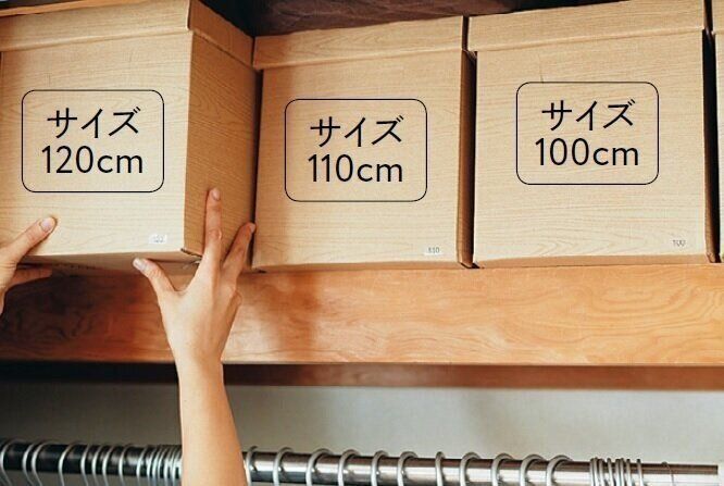 お下がりやオフシーズンの服は100、110……とサイズ別に1箱ずつ保管。男女や半袖・長袖で分けるのをやめたら収納場所を節約できました。必要な服がすぐ見つかって重複買いもゼロに!