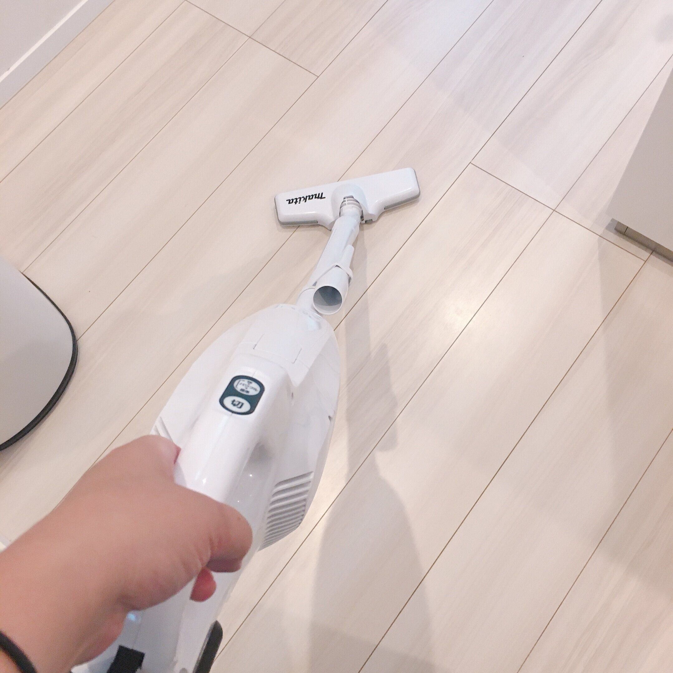 掃除機はコードレスタイプがおすすめ。コードを差す手間がひとつないだけで、ラクに掃除に取り組めます。また掃除機はリビングから死角になっているところに吊るしておくのが便利です。