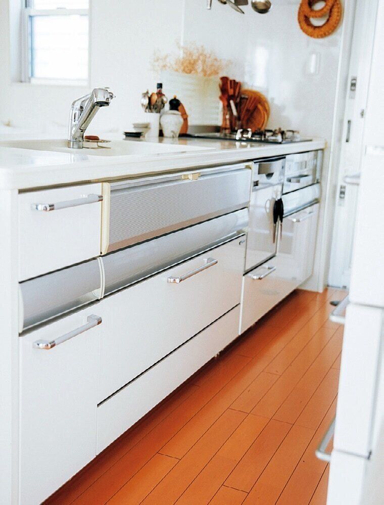 平日5分で家が片づく人のキッチンはどうなっているの?1歩移動するだけで必要な物すべてに手が届く!まさに最高のコックピット。最短ルートで取ってサッとしまえるんです。気になる棚と引き出しを全部見せてもらいました。