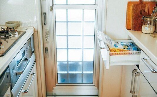 勝手口にいちばん近い引き出しにゴミ袋をIN。勝手口を出た所にゴミ箱があるからゴミ袋の交換がスムーズ。動線にムダがありません。